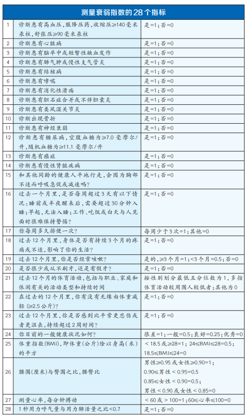 那么,如何計(jì)算自己的衰弱程度呢?研究規(guī)定,衰弱指數(shù)等于個(gè)體符合的疾病或缺陷數(shù),除以納入的疾病或缺陷總數(shù)(即28個(gè))。也就是說,如果一個(gè)人滿足或達(dá)到上述指標(biāo)中的至少7項(xiàng),身體狀況就可能到了衰弱期。