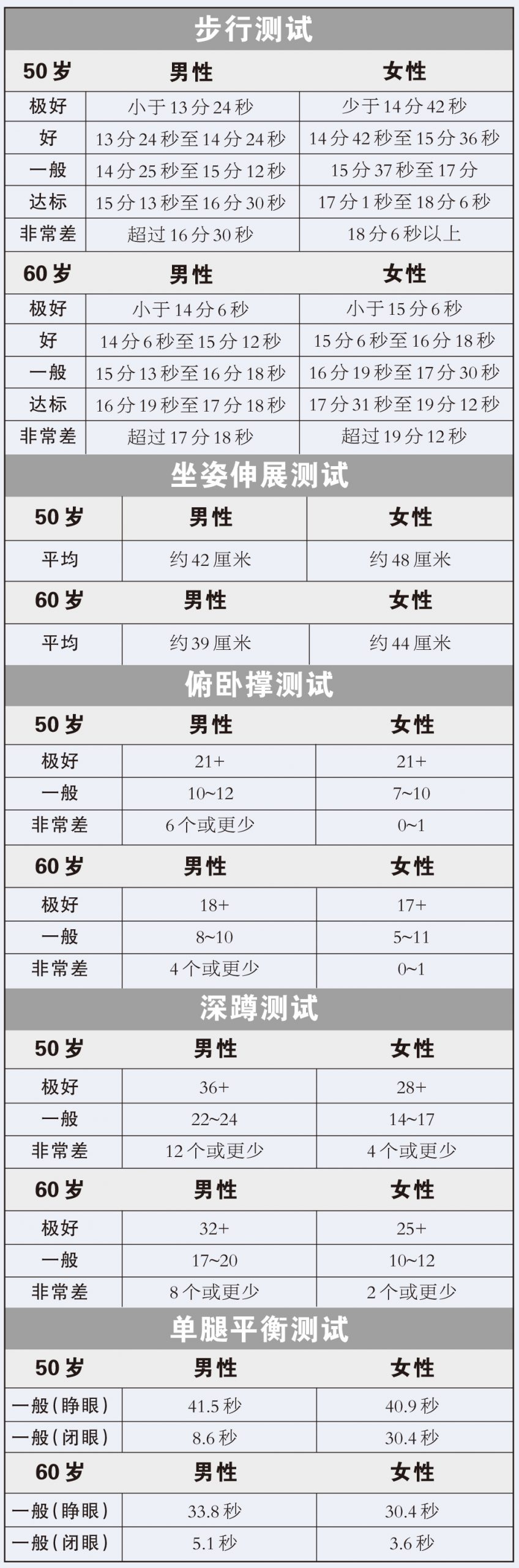 你是怎么發(fā)現(xiàn)自己變老了?是新添的白發(fā)還是皺紋?其實(shí),衰老從來不是瞬間降臨的,美國梅奧診所健康生活項(xiàng)目醫(yī)學(xué)顧問唐納德·韓斯盧德博士表示,了解身體衰老現(xiàn)狀,有助于制訂更有的放矢的個(gè)性化健身方案。美國退休人員協(xié)會(huì)官網(wǎng)最新刊文,推薦“可判斷衰老現(xiàn)狀的5項(xiàng)自我測試”,具體標(biāo)準(zhǔn)如右表,大家可以將其作為參考,進(jìn)行一個(gè)簡單評估。