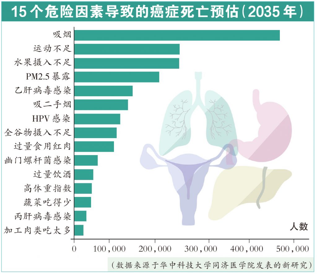 基于2022年中國(guó)癌癥登記數(shù)據(jù),華中科技大學(xué)同濟(jì)醫(yī)學(xué)院研究人員選取了2016年男、女癌癥死亡率排名前十的癌癥作為研究對(duì)象(共12種,在2018年造成的癌癥死亡人數(shù)占比近84%)。在大量數(shù)據(jù)分析后,研究人員最終確定了15種可改變危險(xiǎn)因素,分別是:吸煙、吸二手煙、高體重指數(shù)[BMI=體重(千克)除以身高(米)的平方]、運(yùn)動(dòng)不足、過(guò)量飲酒、蔬菜吃得少、水果攝入不足、全谷物攝入不足、過(guò)量食用紅肉、加工肉類吃太多、乙型肝炎病毒、丙型肝炎病毒、人乳頭瘤病毒和幽門螺桿菌感染,以及PM2.5暴露。其中,2023年對(duì)癌癥死亡影響最大的3個(gè)危險(xiǎn)因素為吸煙、運(yùn)動(dòng)不足和水果攝入不足。