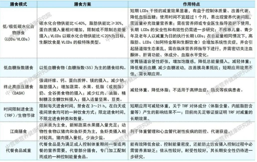 ]]>能量平衡是影響體重的關鍵因素,攝入的能量少于消耗的能量才能實現(xiàn)體重控制的目標,飲食干預在其中起著關鍵作用。飲食干預通過合理調(diào)整飲食結構和控制能量攝入,幫助人們實現(xiàn)健康的體重管理;且飲食干預相對容易實施,不需要高昂的費用和復雜的設備,人們可以在日常生活中輕松進行。因此,無論是從健康角度還是經(jīng)濟角度考慮,飲食干預都是一種理想的體重管理方式。以下我們將重點介紹幾種常見的減重膳食模式,并列出其他一些常見的減重膳食模式及特點供大家參考(表1)。