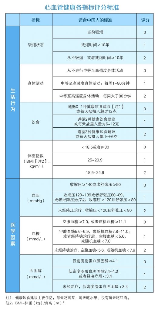 研究人員對(duì)美國(guó)心臟協(xié)會(huì)發(fā)布的評(píng)分標(biāo)準(zhǔn)進(jìn)行了修改,以更適應(yīng)中國(guó)人。7項(xiàng)指標(biāo)具體評(píng)分標(biāo)準(zhǔn)見(jiàn)下圖,得分越高表明該指標(biāo)越健康。